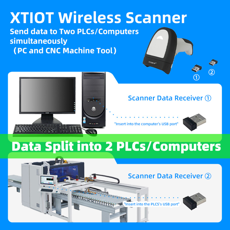XT6202 series of 2D wireless barcode scanner can work with 2 PLC/Computers, etc.