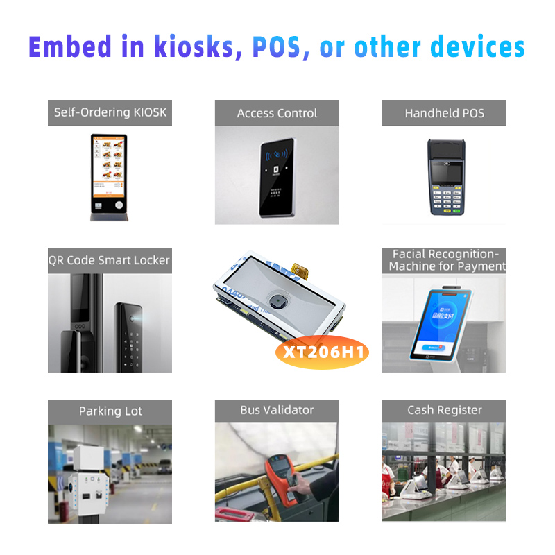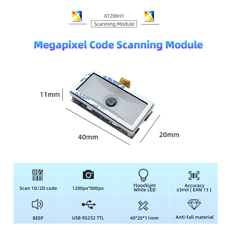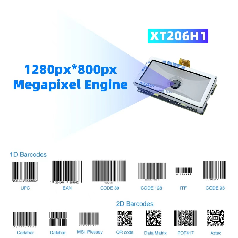 XT206H1 is megapixel barcode scanner engine which suitable for KIOSK, vending machine, wash machine, POS device, door access control, etc.Communication: 5V USB: USB-HID, USB VCOM, USB-HID POS UART: RS232/TTL 3.3V: 12PIN ConnetorCompatible System: Android, IOS, Windows, Linux OS, MAC, etc.Technology: CMOS, 1280*800pxBarcode Decoding Ability: 1D and 2D (Code128, EAN13, EAN8, UPCA, UPCE, QR Code, Data Matrix, PDF417, etc.)Resolution: ≥3milSupport: serial commands controlGet in touch with us to learn more.
