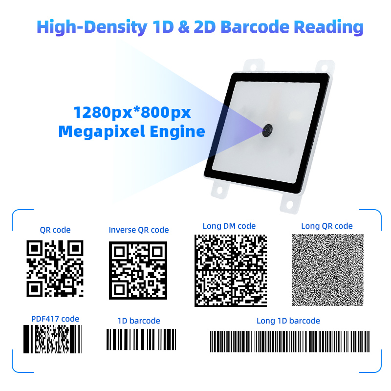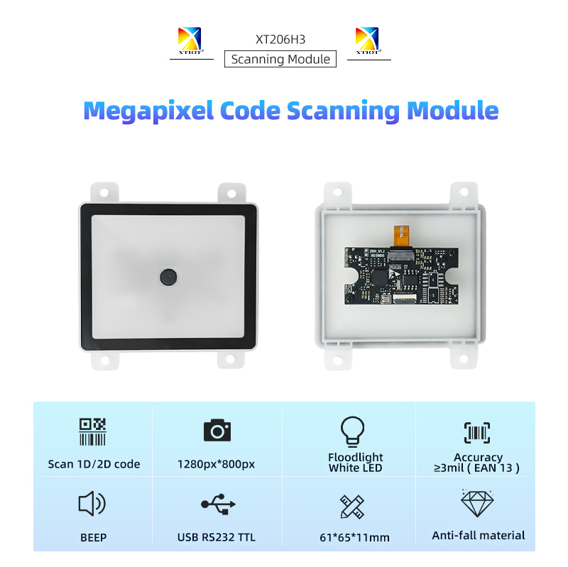 XT206H3 is megapixel barcode scanner engine which suitable for KIOSK, vending machine, wash machine, POS device, door access control, etc.Communication: 5V USB: USB-HID, USB VCOM, USB-HID POS UART: RS232/TTL 3.3V: 12PIN ConnetorCompatible System: Android, IOS, Windows, Linux OS, MAC, etc.Technology: CMOS, 1280*800pxBarcode Decoding Ability: 1D and 2D (Code128, EAN13, EAN8, UPCA, UPCE, QR Code, Data Matrix, PDF417, etc.)Resolution: ≥3milSupport: serial commands controlGet in touch with us to learn more.