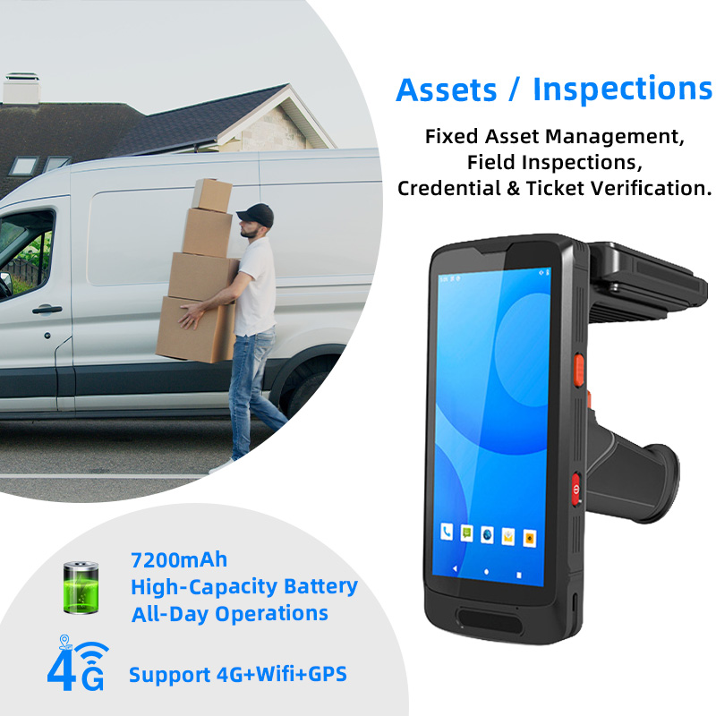 Runs Android 10.0 with 8-core 64bit 2.0GHz processor. Memory options: 4GB+64GB (standard) or 2GB+16GB (optional) . Expandable storage up to 256GB via MicroSD card . IP65 dustproof and waterproof, 1.5m drop resistance, -20°C to +60°C operating range . Battery options: 5200mAh standard or 7200mAh with pistol trigger for extended shifts . Optional modules: UHF RFID, LF/HF/NFC, passport MRZ/OCR .