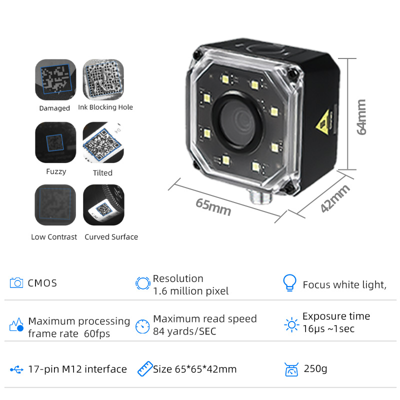 Key Advantages: With 86 scans/second ultra-high speed and 2mm mini code reading capability, it is equipped with a high-sensitivity HDR sensor and anti-reflective optical components. The adaptive lighting system can switch between diffused and directional light according to surface reflectivity, avoiding glare on high-gloss surfaces such as PCB boards and automotive components. Its deep learning decoding algorithm has strong anti-interference ability, which can accurately recognize reflective DPM codes and high-density barcodes, supporting seamless integration with industrial automation systems.