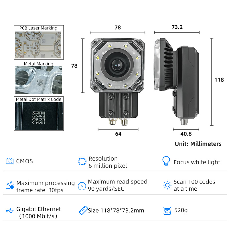 1.6MP high-resolution sensor reads tiny Data Matrix codes on small labels