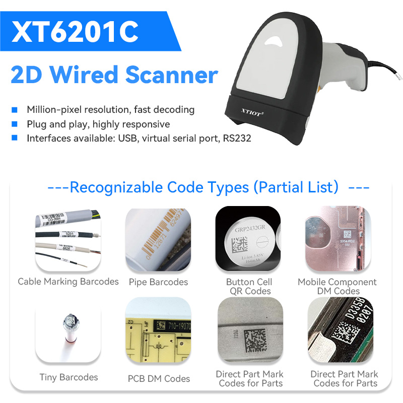 The XT6201 features a 1280×960 megapixel global shutter sensor with industrial decoding algorithms specially developed for laser engraving and dot matrix codes. It offers 100ms fast decoding with motion tolerance up to 2m/s and multiple lens options for different working distances. Widely used in circuit board manufacturing and metal product identification.