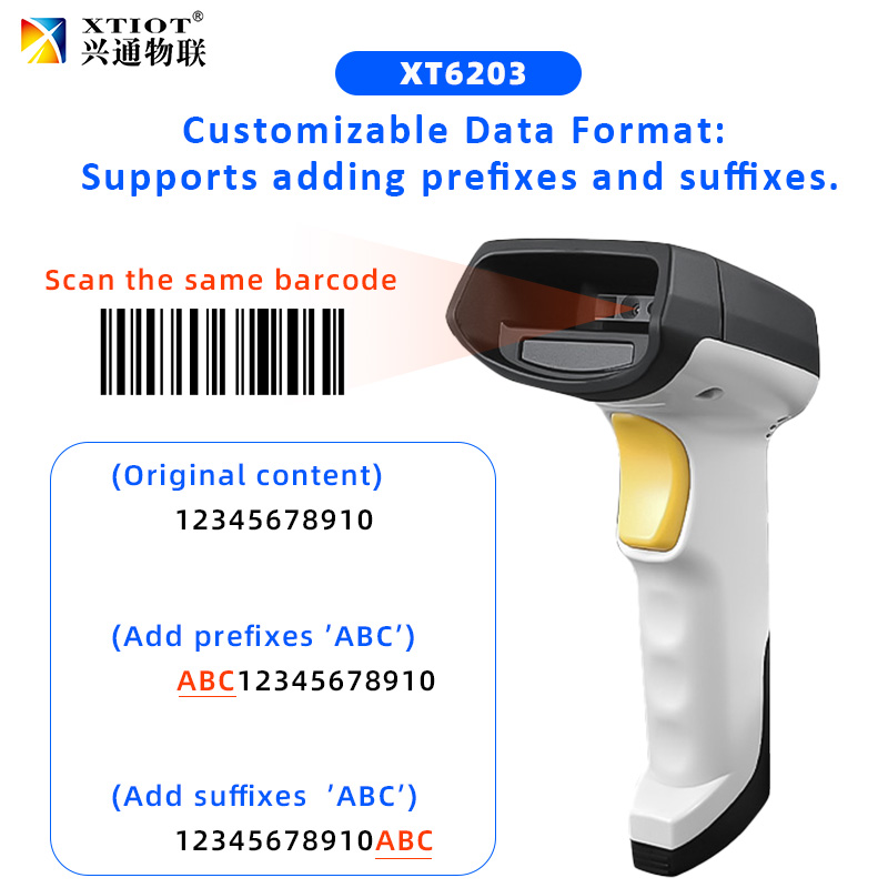XTIOT scanners include programming barcodes in the user manual that allow users to add prefix, add suffix, and configure output formats by simply scanning the corresponding codes . This eliminates the need for software, drivers, or special tools—anyone can configure the scanner in seconds.
