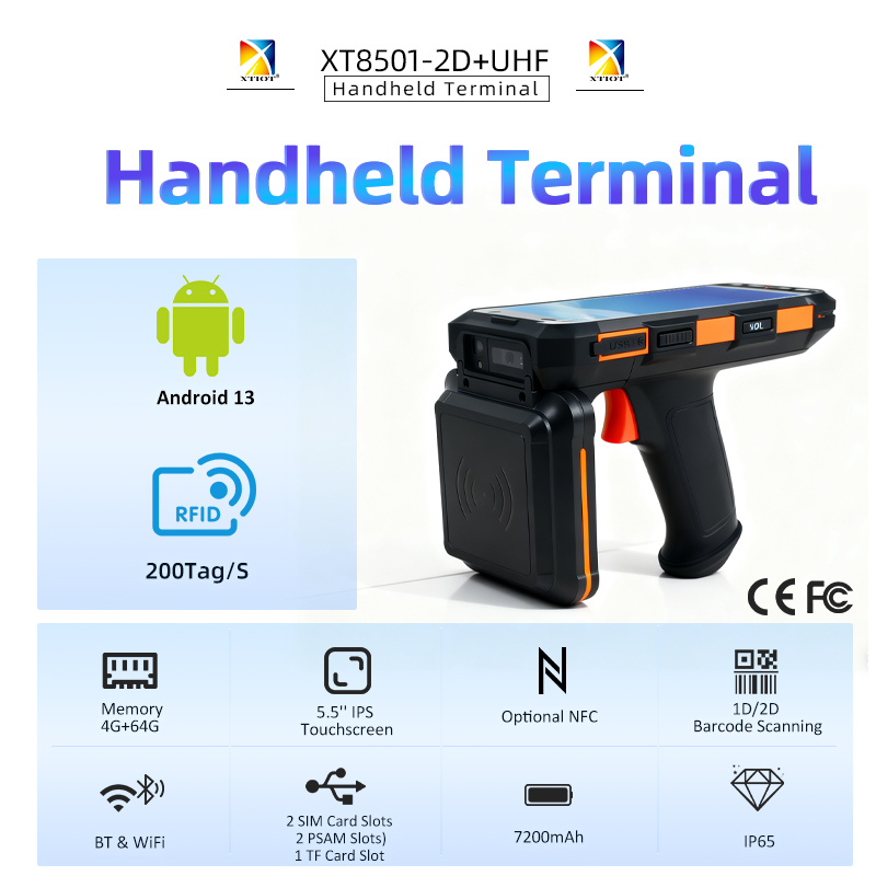 The XT8501 is a UHF handheld RFID reader terminal featuring Android 13 operating system with 4GB RAM + 64GB ROM memory configuration. It supports both 1D/2D barcode scanning and UHF RFID reading in a single integrated device, enabling rapid data capture across multiple identification technologies.