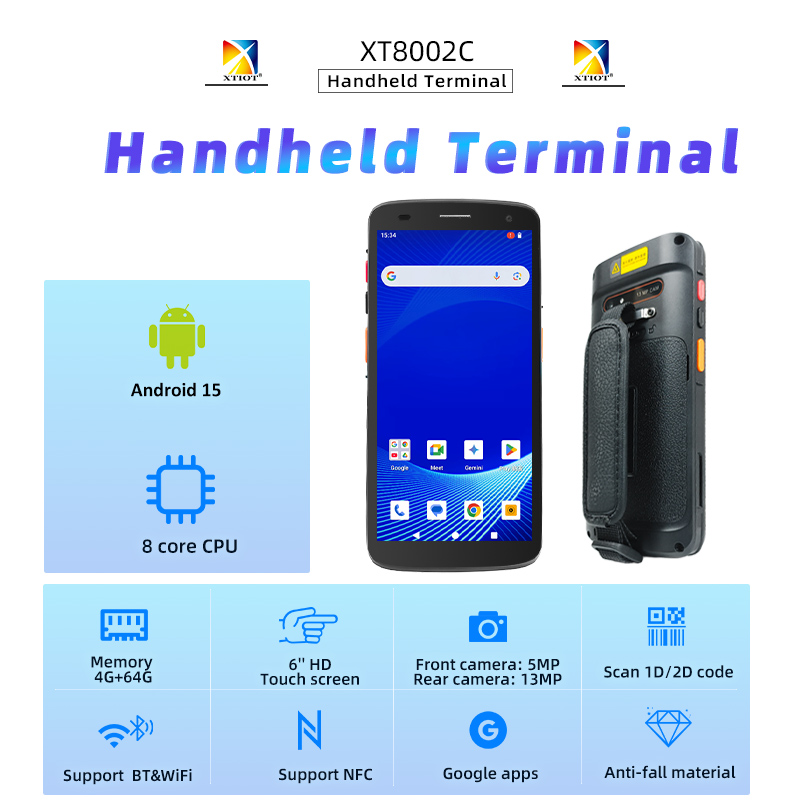 The XT8002C is a high-performance handheld terminal suitable for hotel, airport, and enterprise asset management . It runs on Android 15.0 with Google Mobile Service (GMS) and features a 6-inch HD touch screen with glove support for all-weather operation .