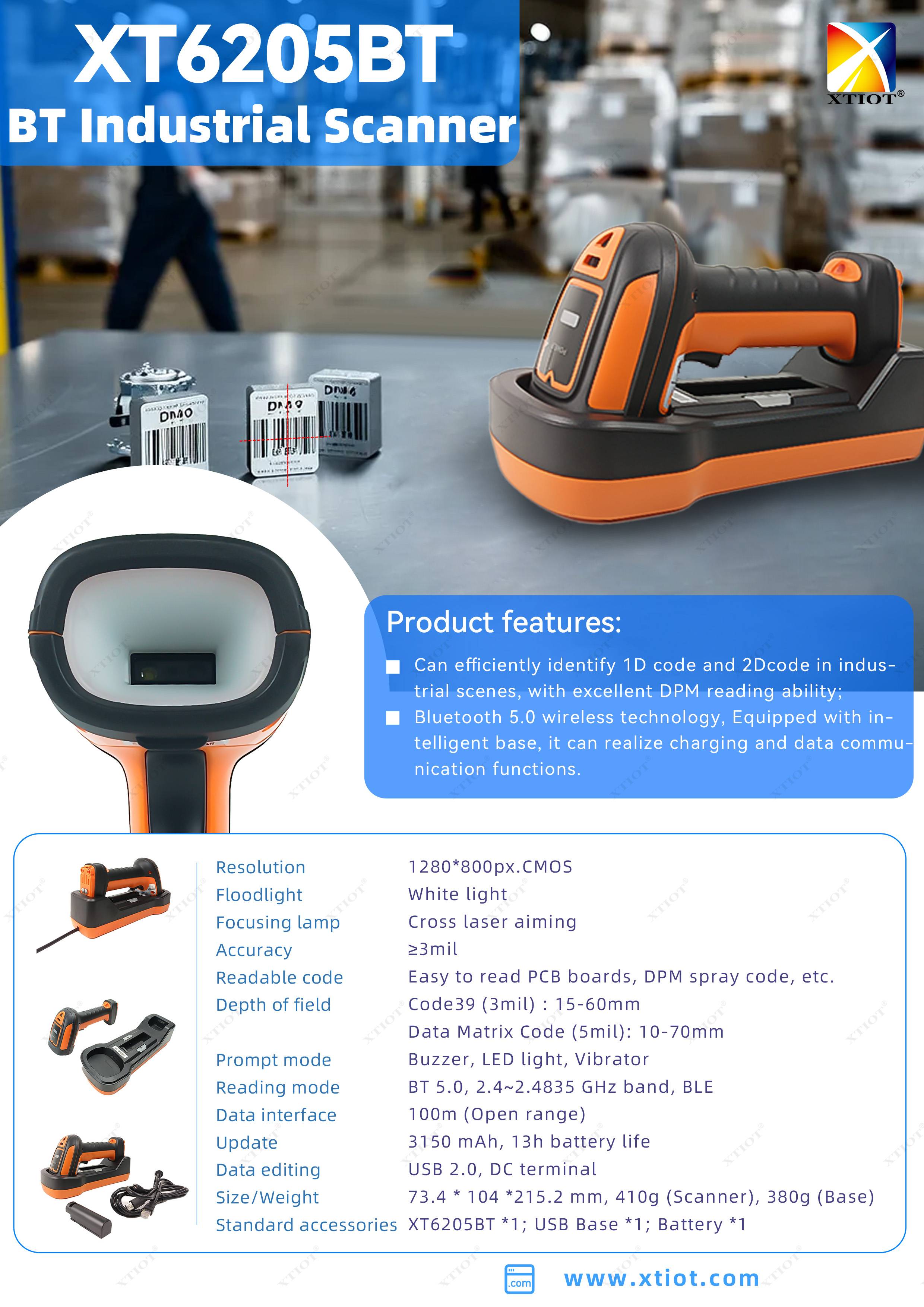 XT6205BT is Industrial use barcode scanner which suitable for manufacturing and warehousing. Technology: CMOS Decoding Ability: 1D, 2D Support: technical supports, demo testing software